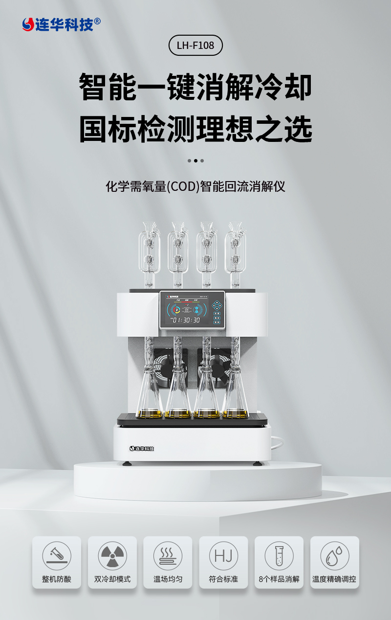 化學需氧量(COD)智能回流消解儀LH-F108  該儀器依據國家新標準《HJ828-2017  水質化學需氧量的測定重鉻酸鹽法》設計制造,同時兼顧原國標,適用于各種生活用水和工業廢水的檢測,儀器內置回流系統,可智能定時,操作簡單